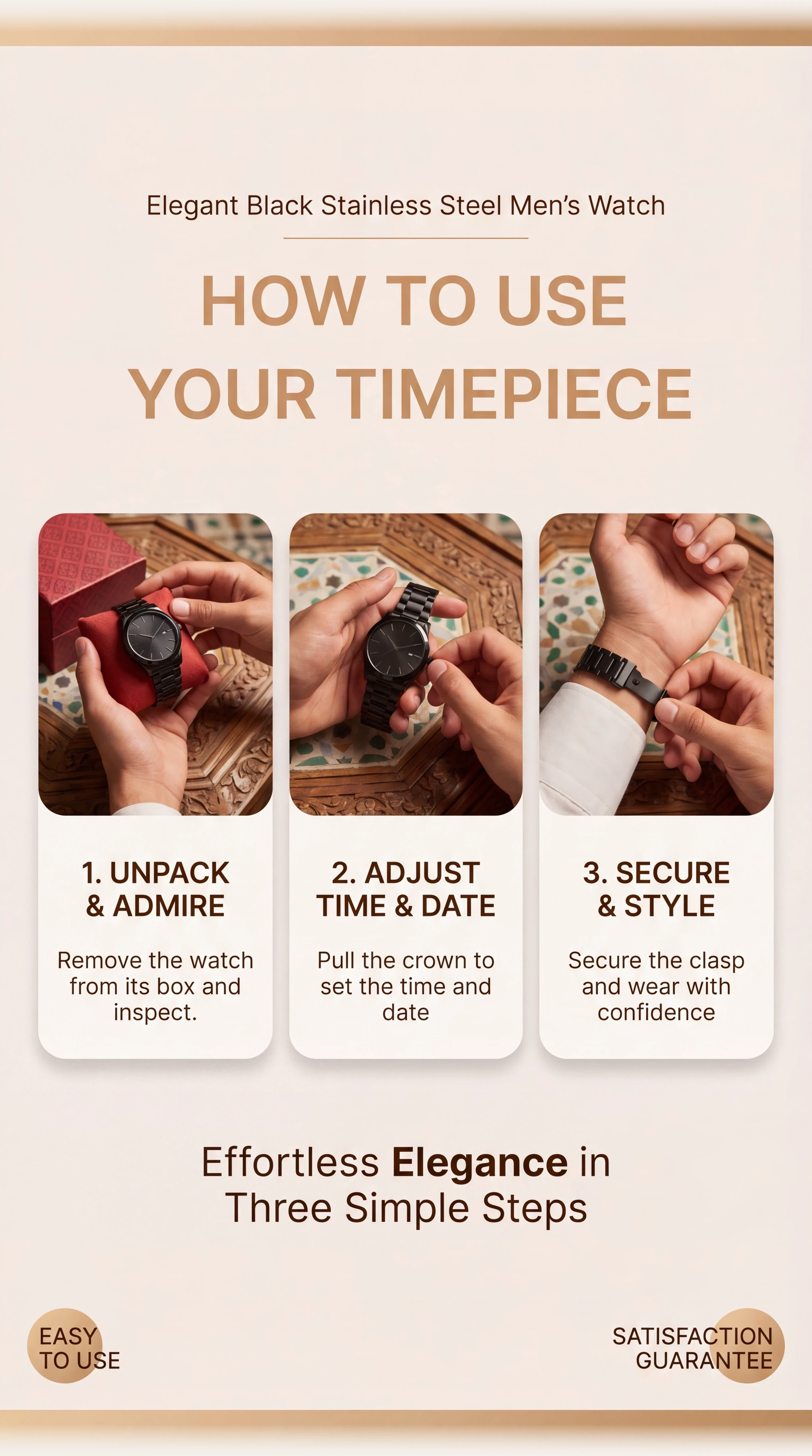 Refined, bold, and effortlessly versatile, this black stainless steel watch is made for the man who values sharp style and everyday function. The sleek minimalist dial, luminous hands, and practical date display bring premium presence to workdays, evenings out, and special occasions alike. Finished with an adjustable strap and delivered in a luxurious red gift box, it is the kind of statement piece that completes your look without trying too hard.